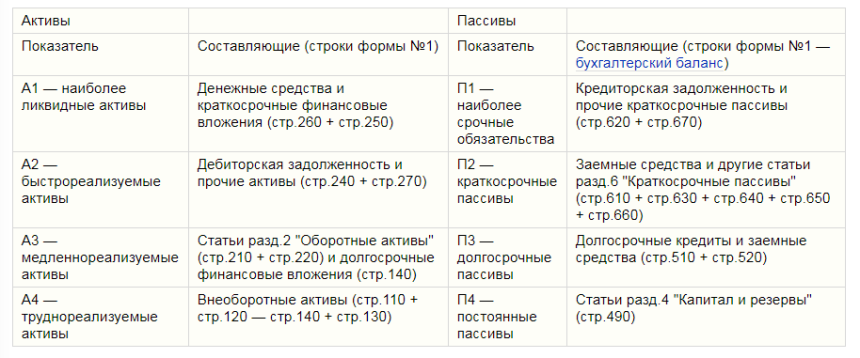 Активы группируют по скорости реализации. А пассивы — по срочности оплаты. Группы активов и пассивов сопоставляются между собой. Подразумеваются, самые ликвидные активы больше высокой высокой срочности, быстрореализуемые обязательства умеренной срочности и так далее. Это говорит о том, что компания платежеспособная.