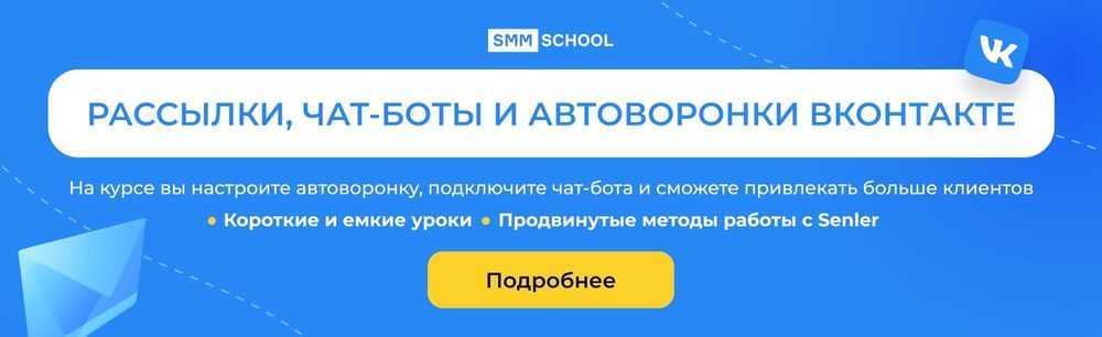 Если нужно подробно изучить чат-боты и рассылки, приходите на 14-дневный практический курс «Рассылки, чат-боты и автоворонки ВКонтакте» от SMM.school. Там научитесь автоматизировать работу с помощью Senler, запускать рассылки, прогревать и продавать во ВКонтакте. Это самое актуальное руководство по автоматическим инструментам для продвижения бизнеса в ВК на данный момент.