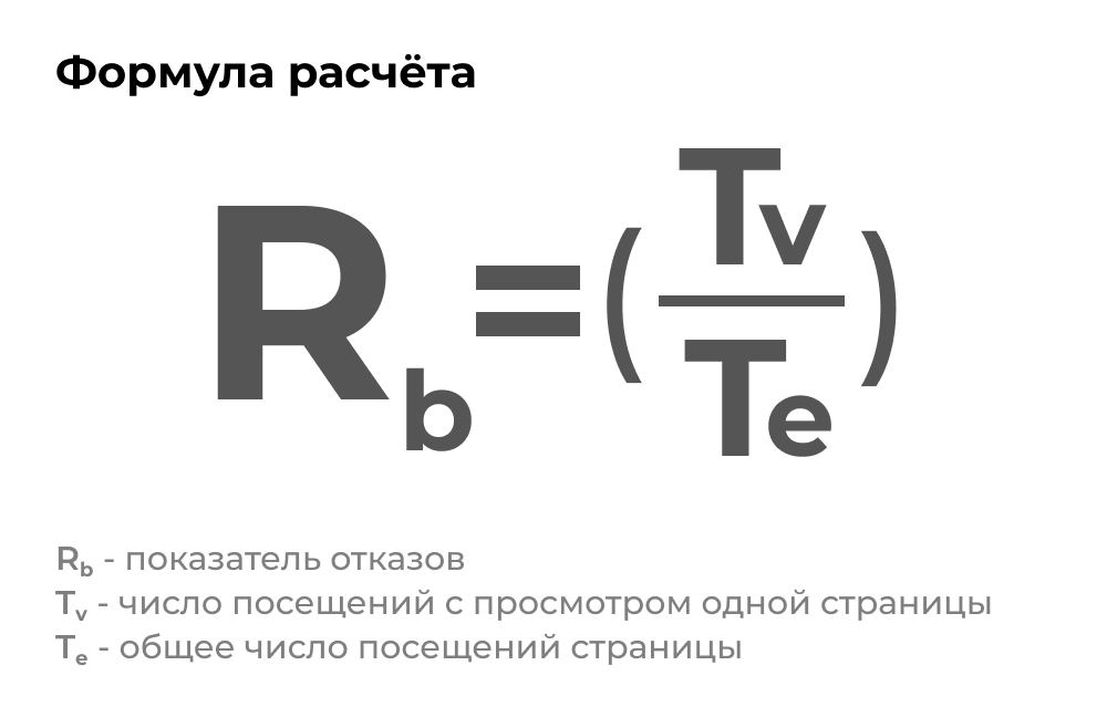 На этом этапе в первую очередь нужно смотреть на показатель отказов — Bounce Rate. Он расскажет, сколько пользователей после перехода на сайт сразу же с него ушли или посетили не более одной страницы. Ниже — формула расчета Bounce Rate и список причин, по которым пользователь может уйти с сайта.