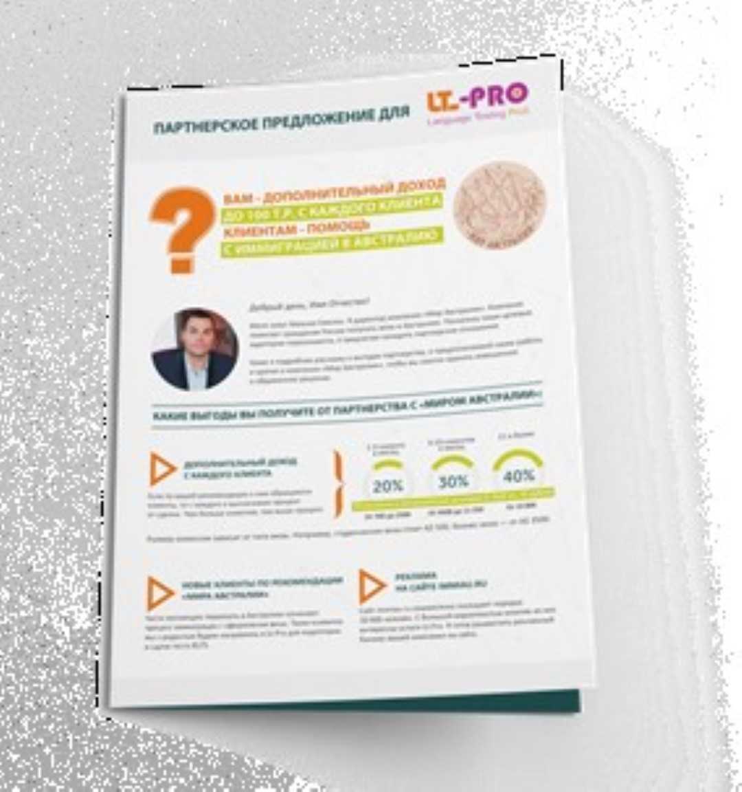 Начнем с примера. Ко мне обратился владелец компании «Мир Австралии» Максим. Компания помогает гражданам России получить визу в Австралию. Максим хотел наладить партнерские отношения с экзаменационным центром LT-PRO. Я узнал у Максима условия партнерства и оформил их в предложение: