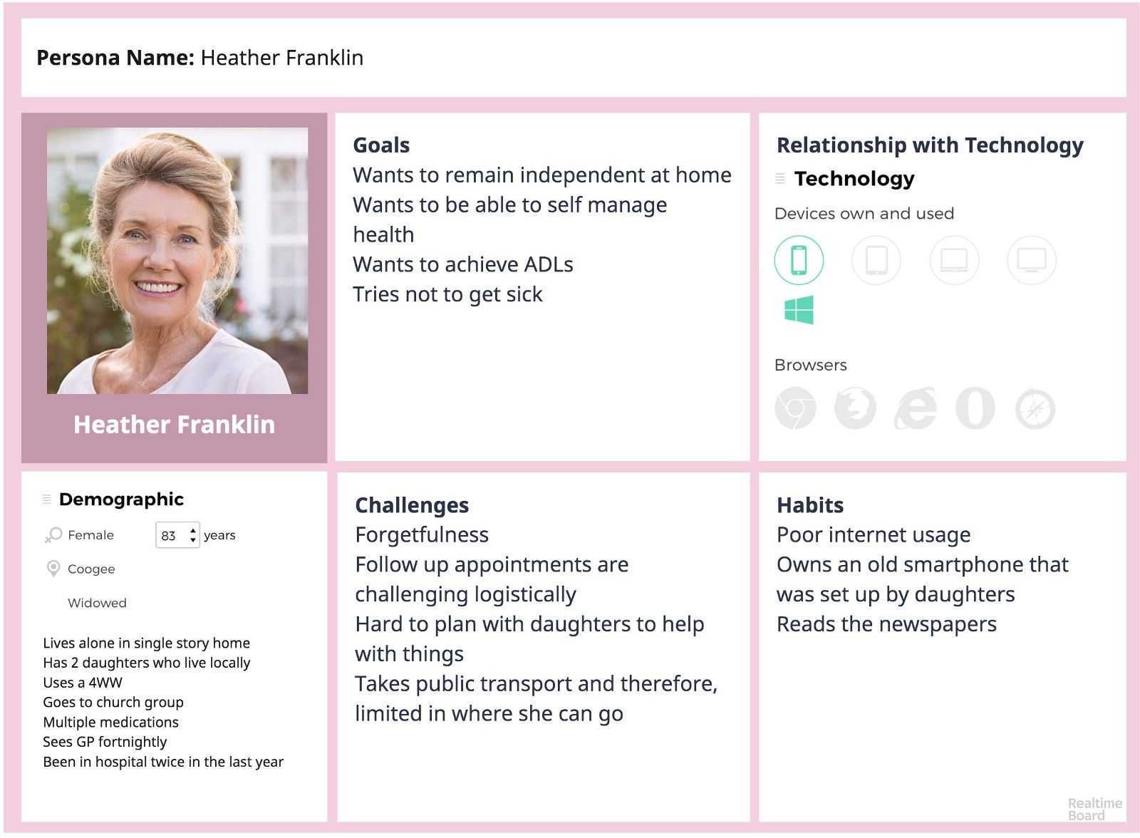Портрет целевой аудитории. Пример и шаблон того, как можно красиво оформить образ клиента. В середине расположена фотография девушки, слева — ее данные и информация о целях и потребностях. Справа расположен блок с устройствами, из которых пользователь заходит в интернет, а над ним представлена история клиента.