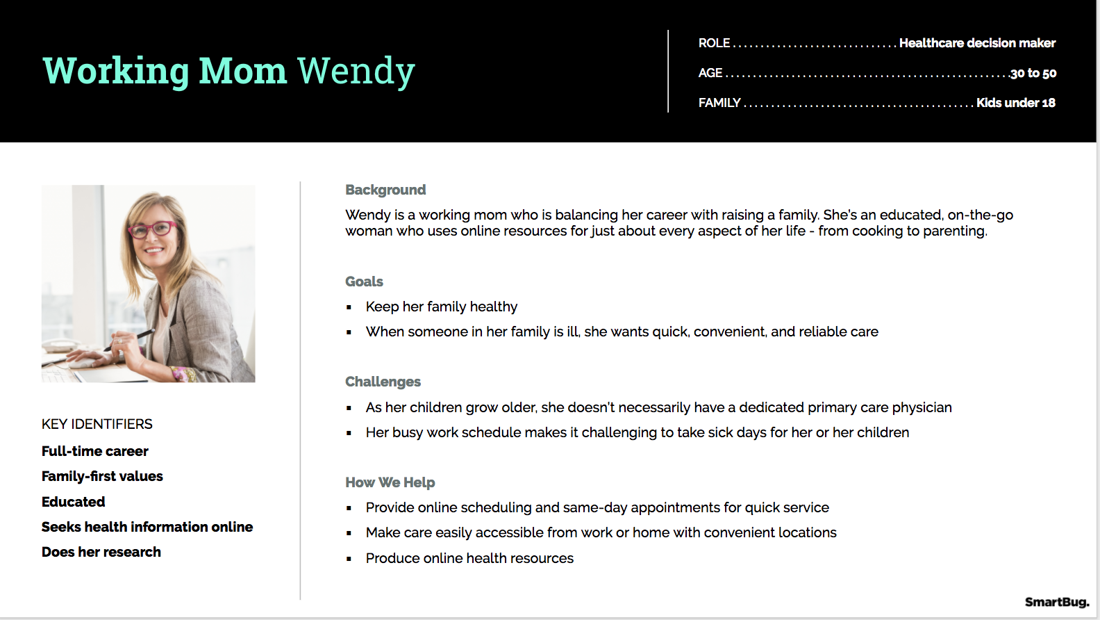 Аватар клиента. Пример, приведенный ниже, рассказывает о работающей матери Венди. Этот портрет был создан для сферы здравоохранения. Женщина переживает о здоровье своей семьи, но не может проследить за этим. Постоянно находится в стрессе. В примере предложены варианты того, как успокоить мать и помочь ей. Решения: быстрое обслуживание, онлайн-ресурсы, чтобы получить информацию, и доступ к медицинским услугам недалеко от дома или рабочего места.