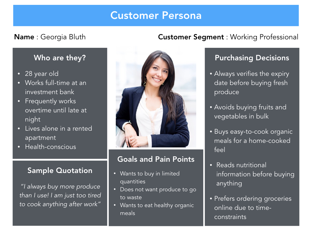 Портрет потребителя. Пример, которой приведен ниже, рассказывает о девушке по имени Джорджия. Она много работает и в связи с этим тратит большое количество денег на готовую еду. Джорджия хочет сократить расходы, начать заботиться о своем здоровье и употреблять полезную для организма пищу. Девушка старается следить за составом продукта и его сроком годности.