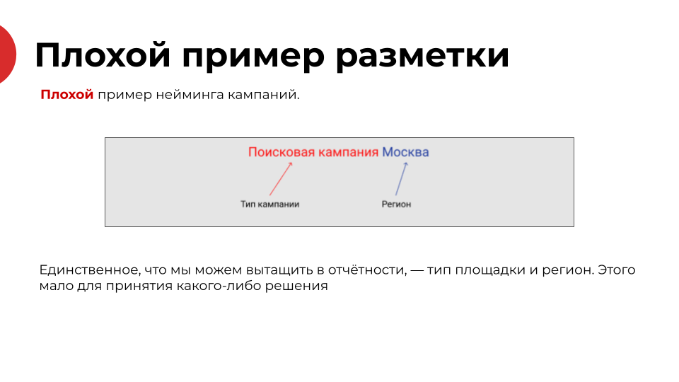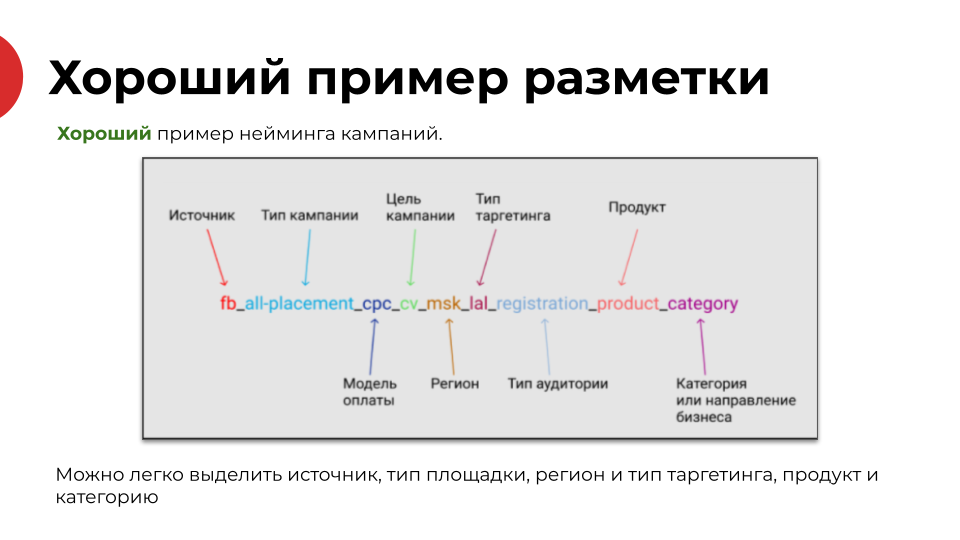 Тестирование гипотез начинается не с запуска. Сначала стандартизируйте названия кампаний и UTM-метки. Без этого невозможен полноценный анализ результатов. Поможет справочник разметки — таблица со всеми параметрами кампаний. Он обеспечит одинаковую структуру меток и упростит вам формирование и анализ отчётности.