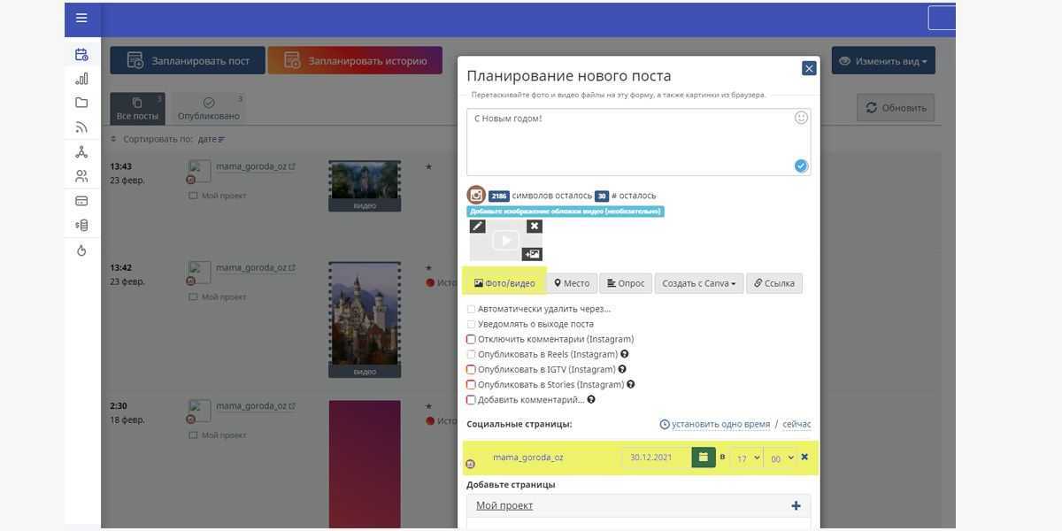 - Загрузите видео, добавьте описание и настройте время выхода поста в сеть.
