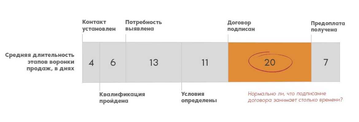 Чтобы сократить общую длину сделки, посчитайте среднее время для каждого этапа продаж. Так вы поймете, какой этап можно оптимизировать.