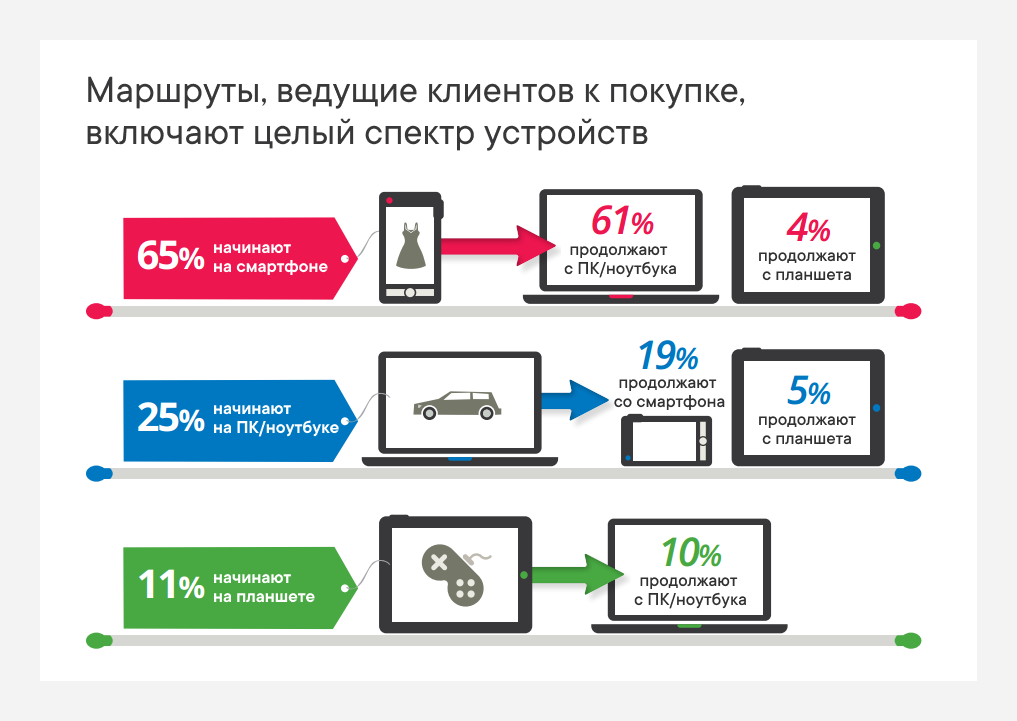 Все точки должны быть подключены к единой базе персонализации контента, товарных рекомендаций и предложений, чтобы создавать максимально релевантный и уникальный опыт для каждого конкретного пользователя. Ведь 85% (!) пользователей начинают шопинг на одном устройстве, а заканчивают на другом (Google).
