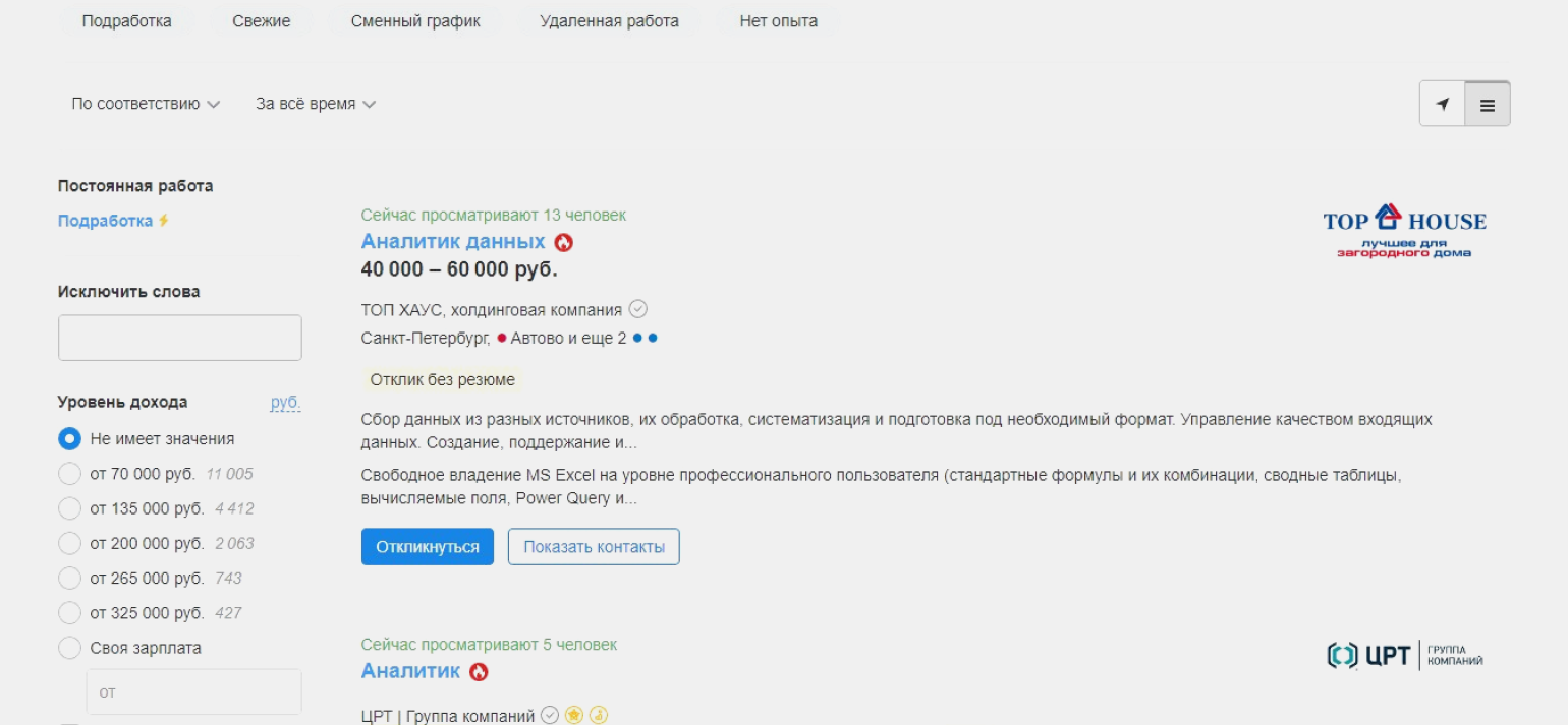 Рядовым аналитикам платят 40–70 тысяч рублейСкриншот: hh.ru
