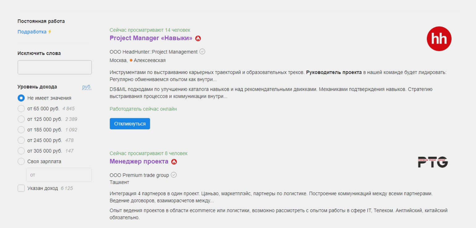 В 33% вакансий менеджеру проектов готовы платить более 125 тысяч рублей в месяцСкриншот: hh.ru
