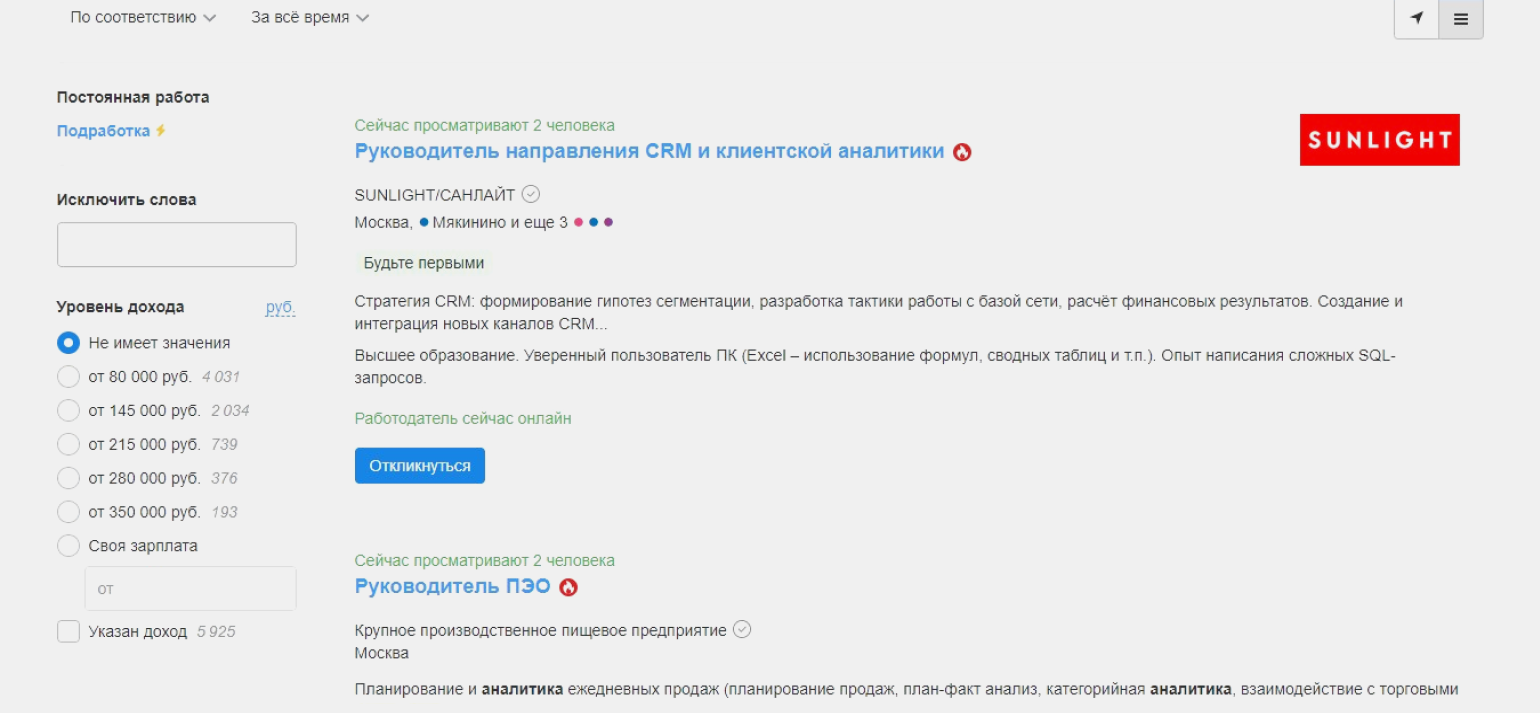 Руководителю направления аналитики готовы платить от 80 тысяч ежемесячноСкриншот: hh.ru