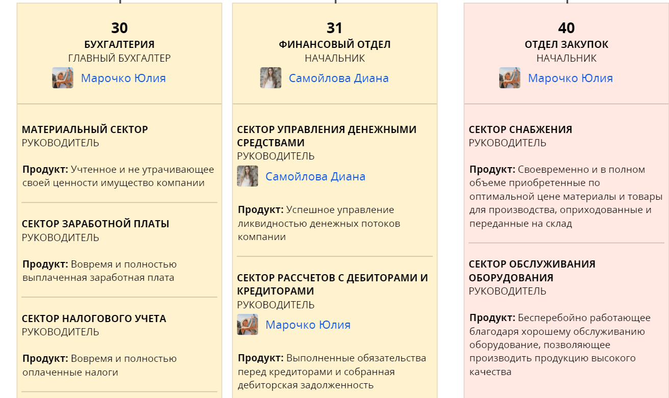 Поток производства состоит из работников, офиса, рекламы, продаж, выручки, покупки материалов, производства продукции, найма и обучения новичков, контроля качества. Разрабатывая оргструктуру компании таким образом, вы поймете, каких функций не хватает. Например, нет маркетологов, пиарщиков, работников в отделе контроля качества.