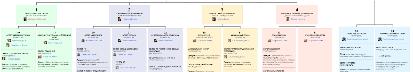 При создании оргструктуры компании, на ней нужно расставить сотрудников, указать их обязанности и и конечный продукт каждого человека. Оргструктура помогает наладить эффективное взаимодействие между должностями, так как каждый увидит, кто и, за что отвечает в организации.