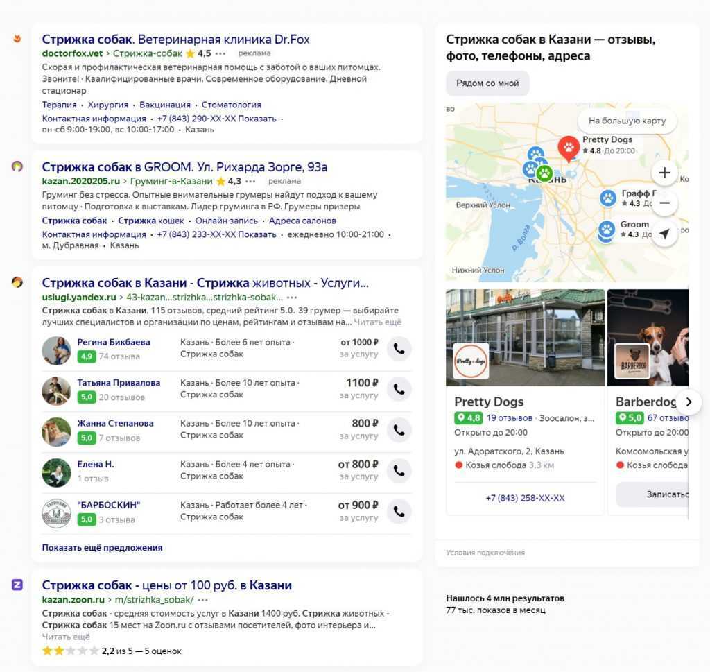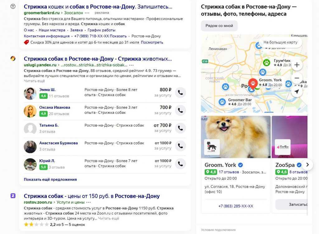 Это слова или фразы, которые люди вводят без указания места, но системы понимают, что скорее всего человека интересует ближайший товар или услуга. По таким ключевикам выдача будет отличаться. Давайте посмотрим, как это выглядит на практике. Например, введем в ПС «стрижка собак», находясь в Ростове-на-Дону. Вот, как выглядит первая страница: