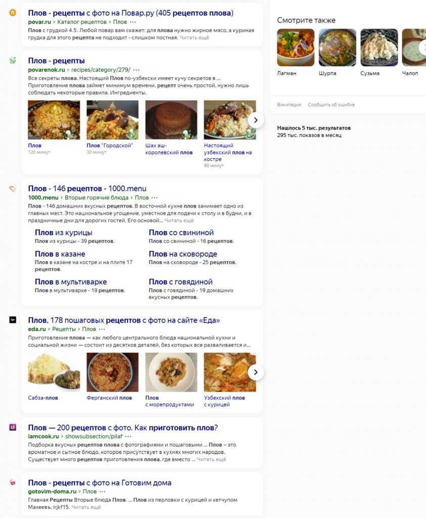 По ним результаты поиска будут одни и те же. Обычно это информационные или топонимические ключи. Например, «приготовить плов», «купить двери в Тольятти», «доставка пиццы Таганрог». Проверить это можно так же, как в предыдущем случае – сравнив первую страницу.
