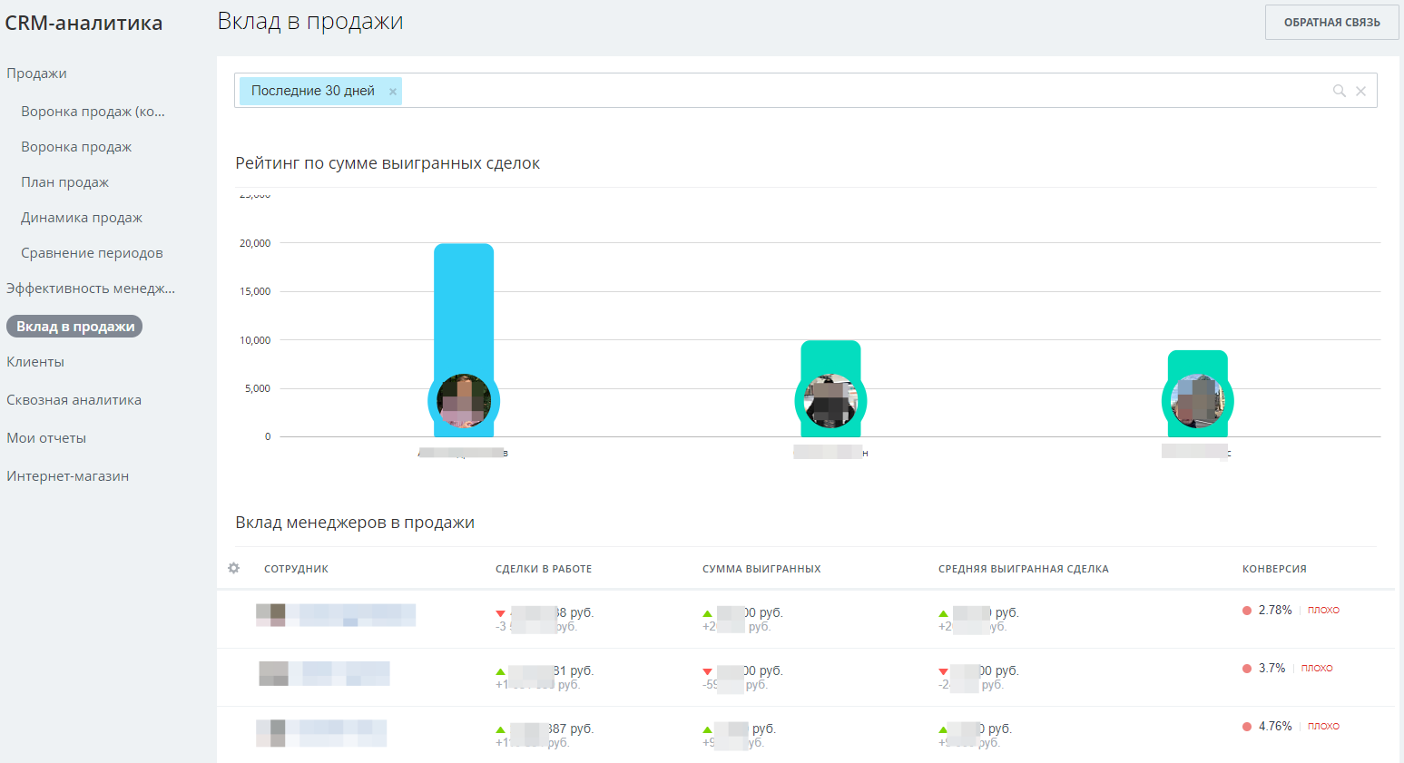В CRM есть функционал, который позволяет просматривать готовые шаблонные отчеты, а также настраивать собственные — например, через системы сквозной аналитики.