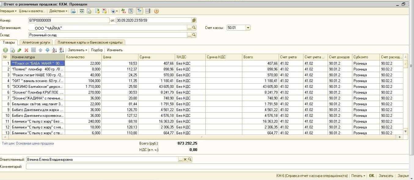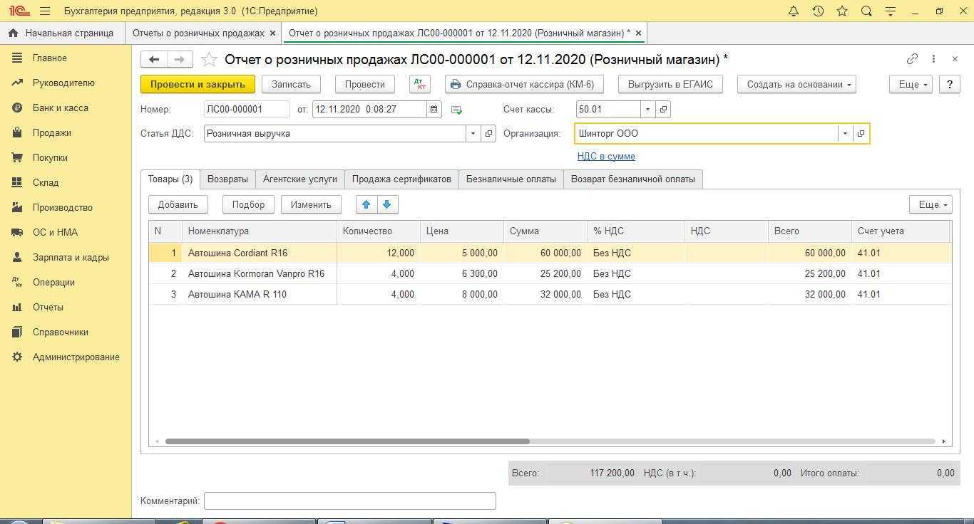 Пример заполнения отчета о розничных продажах в 1С 8.3 по наличке и по картам выглядит так:
