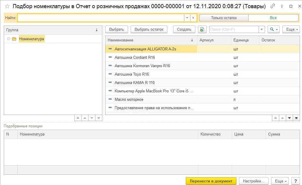 Для склада «Неавтоматизированная торговая точка» документ заполняется вручную. Нажатием кнопки «Подбор» открывается справочник «Номенклатура», из которого выбираются нужные товары. По окончании выбора нажмите кнопку «Перенести в документ» и заполните цену реализации для каждой позиции. Счета учета программа заполнит автоматически.