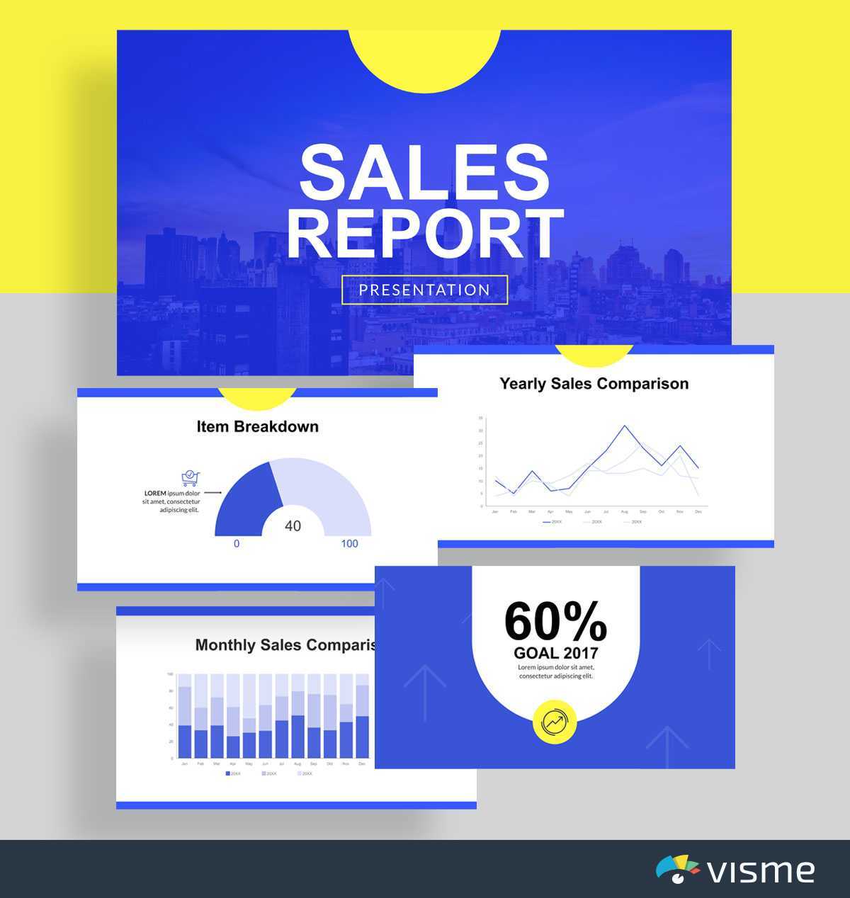 В приведенном ниже образце отчета о продажах содержится достаточно слайдов с диаграммами, чтобы организовать данные в надлежащем порядке. Используя редактор Visme, вы можете добавлять слайды в шаблон, если необходимо добавить поясняющий контент.