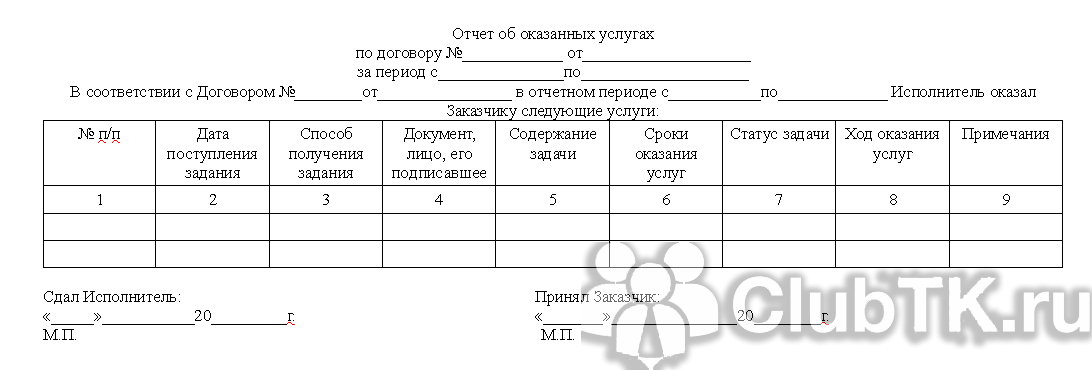- перечень выполненных задач (наименование услуг для отчета исполнителя указывается в соответствии со списком в договоре и приложениях к нему);