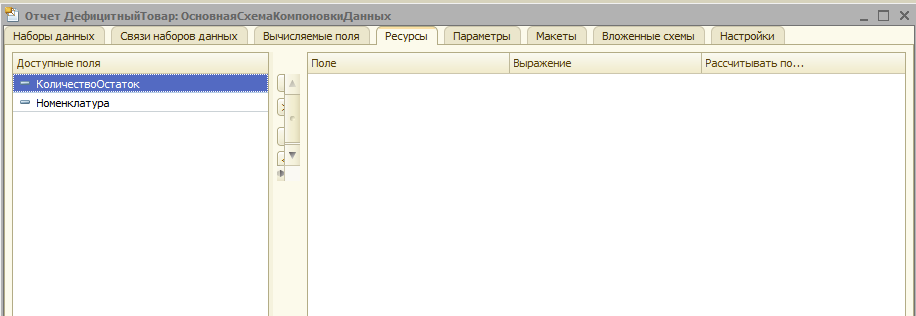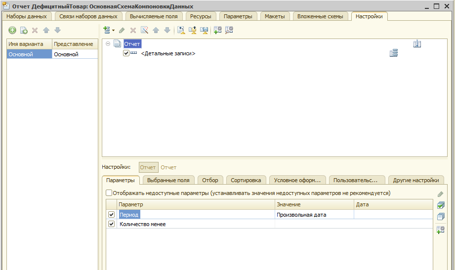Для создания отчета «Дефицитный товар» была создана схема компоновки данных, в которой определены ресурсы, настройки, связи и т.п.