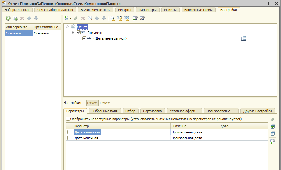 Для создания отчета «Остатки товаров» была создана схема компоновки данных, в которой определены ресурсы, настройки, связи и т.п.