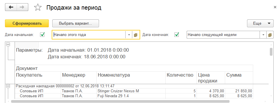— отчет «Продажи за период», выполняющий выборку информации о всех реализациях за период.