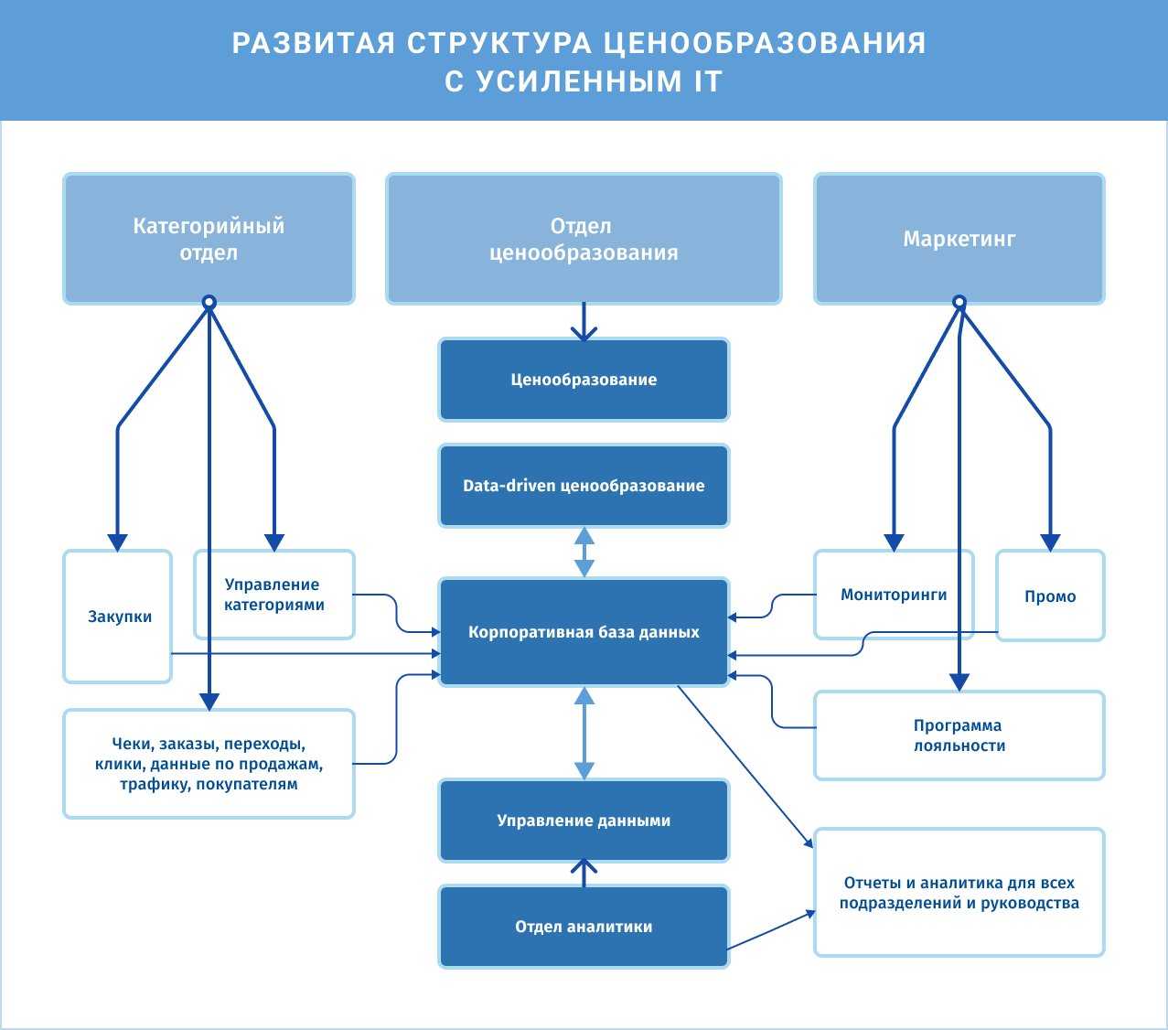 В корпоративных базах данные очищаются, обрабатываются и хранятся в объеме, необходимом для операционной работы и принятия тактических и стратегических решений. Ядро такого хранилища – данные чеков, или заказов, с данными по закупочной цене, KVI, истории промо, программам лояльности, по покупателям. Отдел аналитики берет на себя управление базами, координирует очистку и проведение данных в необходимые форматы, формирование аналитики в различных разрезах. В такой схеме отдел ценообразования получает больше данных для более качественного ценообразования и снимает с себя трудоемкие задачи по сведению информации из разных источников – подразделений компании, формируя необходимые запросы в корпоративное хранилище данных.