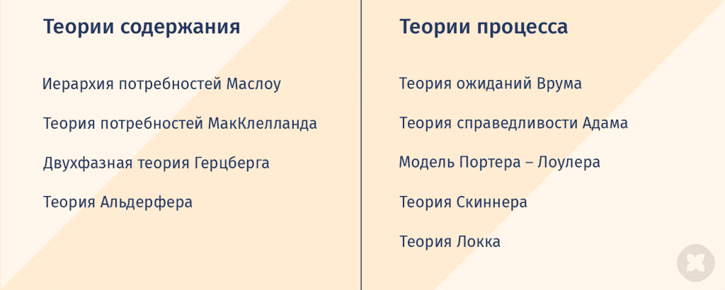 Основные содержательные теории: иерархия потребностей Маслоу, теория МакКлелланда, двухфакторная теория Герцберга и другие.
