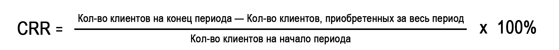 CRR напрямую зависит от оттока клиентов, или Churn Rate — метрики, показывающей процент потребителей, которые отказались от услуг компании, отменили подписку или заказ. Например, если показатель CRR — 80%, значит CR будет равен 20%: компании удается удерживать постоянных покупателей и развивать свой бизнес.
