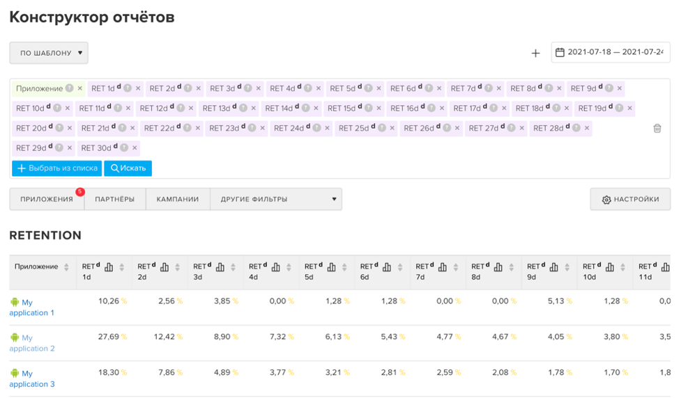 Удобно, если вы хотите применить дополнительные настройки, отфильтровать данные или посмотреть в одном окне сразу несколько метрик, а не только коэффициент удержания. Зайдите в «Конструктор отчетов» → «Выбрать из списка» → «Периодические метрики» → «Retention» или «Rolling Retention». Отчеты разных приложений можно сравнивать между собой, а данные, при необходимости, выгружать в Excel.