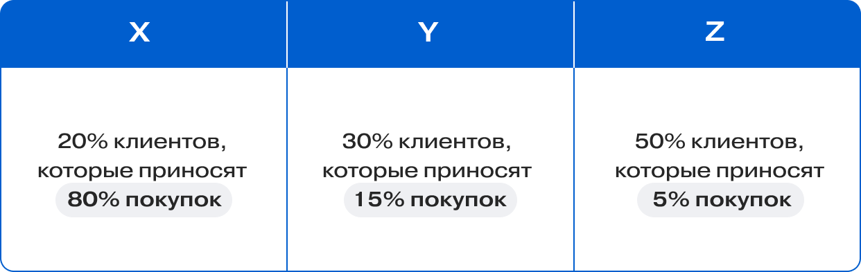 В основе сегментации лежит закономерность, которую в XIX веке обнаружил итальянский ученый Вильфредо Парето. Его исследование показало, что 80% национального богатства Италии принадлежит 20% семей. Эта закономерность, называемая принципом Парето, применяется в большинстве аспектов жизни: примерно в 80% случаях мы носим 20% своего гардероба, используем 20% фичей телефона, общаемся с 20% своих контактов и так далее.