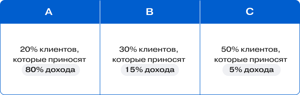 Разделение на такие категории позволяет продумать разный подход к клиентам, установить разные уровни их обслуживания так, чтобы больше внимания было сосредоточено на самых доходных клиентах. То есть чтобы 80% ресурсов компании направлялось на тех, кто приносит 80% дохода. А 20% ресурса — на тех, кто приносит 20% дохода.