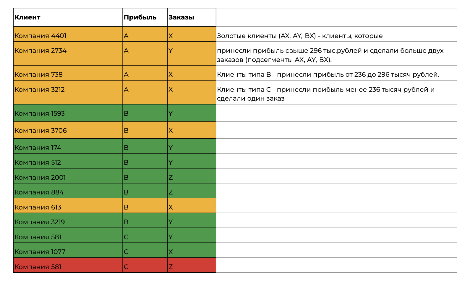 После выполнения анализа данные заносятся в сводную матрицу. Клиенты, которые попали сразу и в группу А, и в группу X, а также клиенты, которые попали сразу и в группу A, и в группу Y — это «золотые» клиенты.