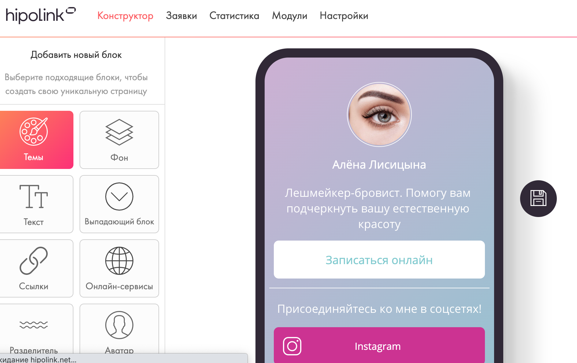Самая популярная соцсеть для специалистов бьюти-индустрии – это Инстаграм. Но для большего охвата целевой аудитории создайте группу ВКонтакте. Если любите и умеете снимать видео – обзаведитесь каналом на YouTube и профилем в TikTok. Обязательно разместите ссылки на все ваши аккаунты на сайте: у Hipolink для этого есть отдельный инструмент, вам нужно лишь вставить ссылки.