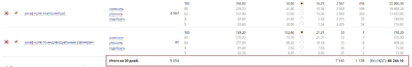 Условная единица — это 30 рублей. То есть, чтобы получить стоимость контекстной рекламы в рублях, нам нужно каждое число умножить на 30.