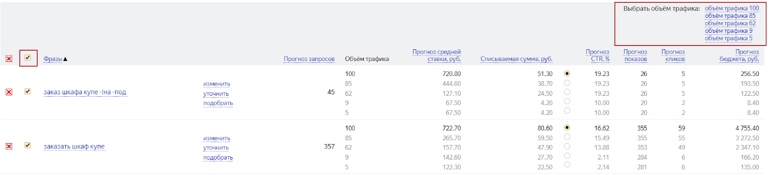 Выделяем все нужные фразы и выбираем объем трафика.