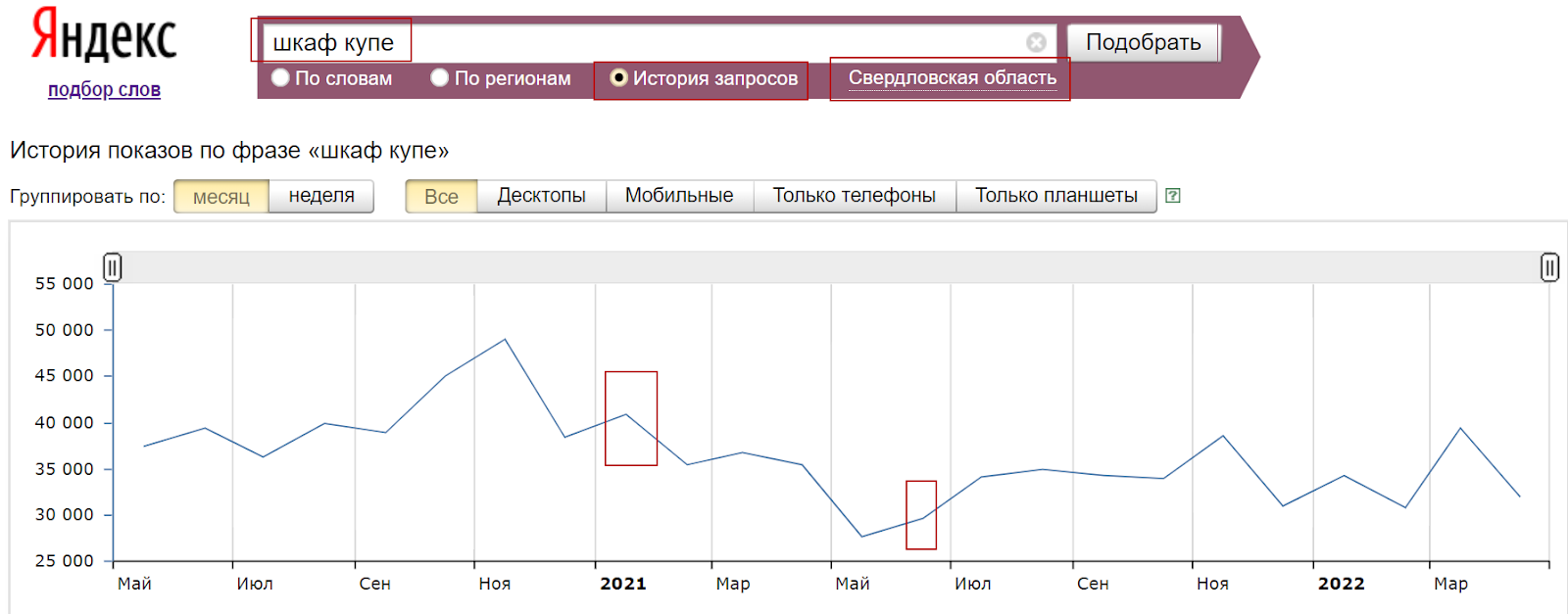 Прогнозатор генерирует результаты, ориентируясь на данные статистики за прошедший период. Рекламные системы собирают информацию за определенные временной промежуток. Обычно используются сведения за последние 28 дней. Но активность по запросам не всегда одинакова. У большинства запросов есть определенная сезонность, периоды роста и спада активности.