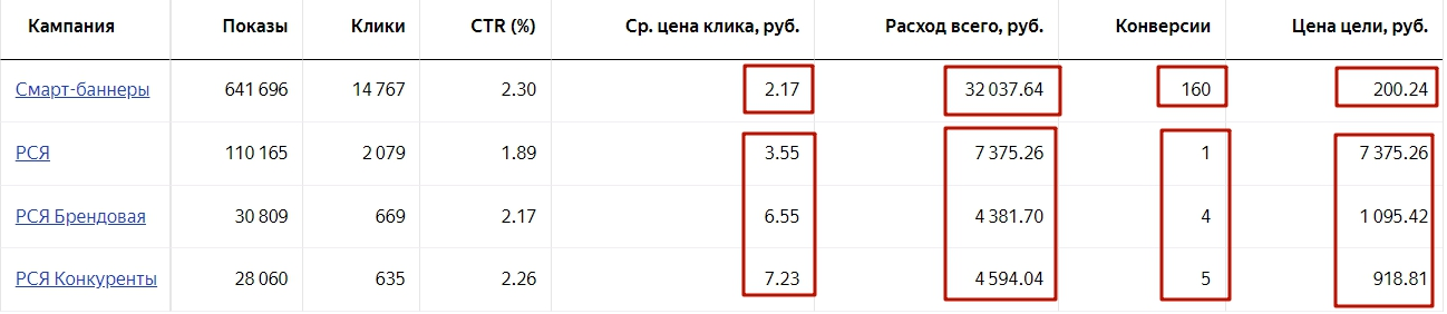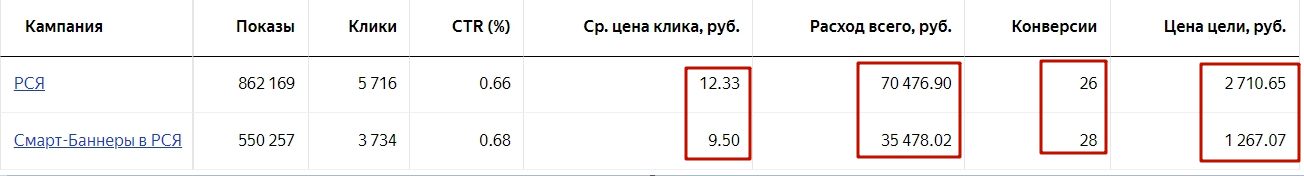 Товары для фермеров. Цена клика в смарт-баннерах ниже, чем в стандартных кампаниях РСЯ, и практически все конверсии (здесь это заказы) идут со смарт-баннеров. Поэтому бюджет в Смартах в два раза выше, чем в трех кампаниях РСЯ.