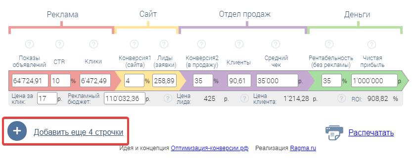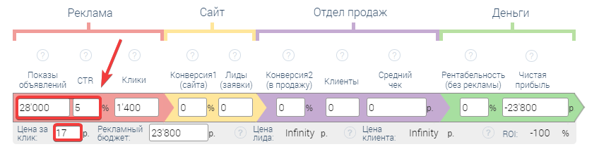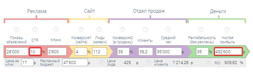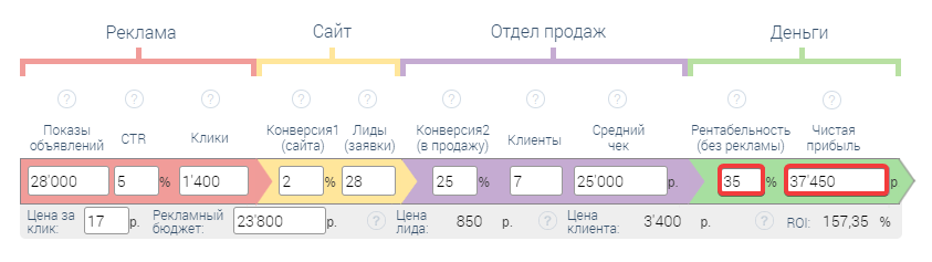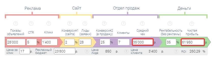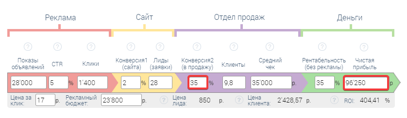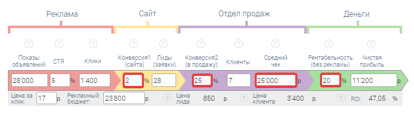 Указываем: конверсия1 (сайта), конверсия2 (в продажу), рентабельность (без рекламы)