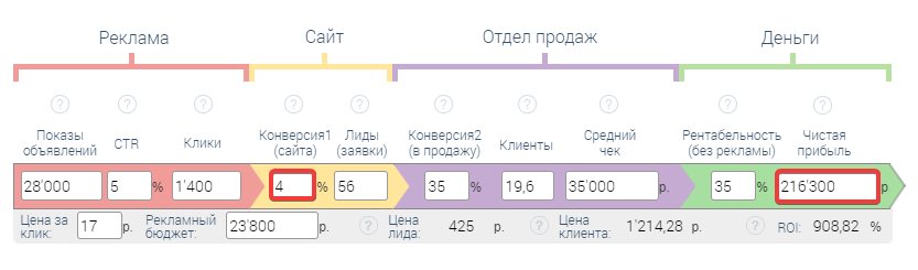 Займетесь сайтом, сконцентрируетесь на том, чтобы сделать его более удобным, донести ваши выгоды до клиентов и, например, сделаете конверсию не 2%, а 4%. Смотрите на сколько значительно изменилась ваша чистая прибыль, при том, что остальные показатели остались неизменными, вы только повлияли на конверсию сайта.