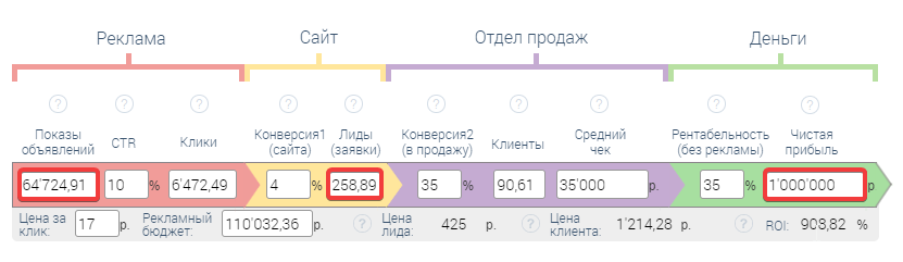 Допустим 432 600 рублей в месяц вас не устраивает, нужен 1 000 000 руб. Соответственно, вы задаете свою цель и видите сколько вам нужно сделать продаж (258 заявок обработать, 64 000 посещений на сайт).