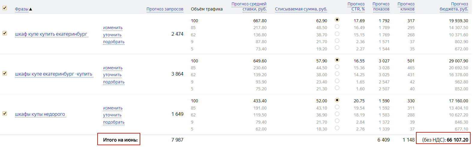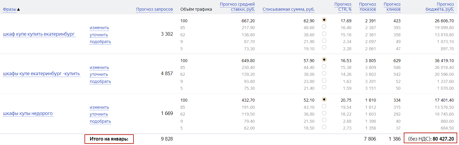 Когда все настройки указаны, нужно выполнить расчёт. Он производится после нажатия на кнопку «Посчитать» внизу страницы. Появится форма со списком ключей, по каждому из которых будут показаны прогнозируемое число запросов, средняя цена клика, списываемая сумма, прогнозы CTR, показов и требуемого количества денег.