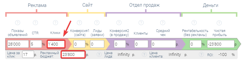Как мы видим рекламный бюджет сильно отличается от того, который мы получили в Прогнозаторе бюджета, это происходит из за того, что в прогнозе не учитываются многие факторы. Не волнуйтесь, в дальнейшем мы с вами поймем, что меняя значения, мы можем добиться требуемых нам показателей.