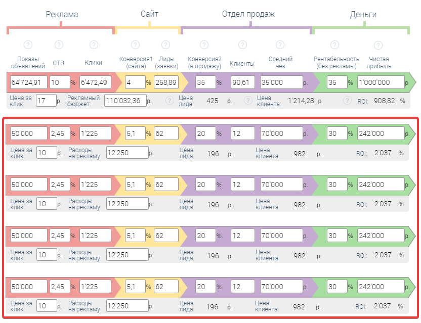 Например, поставить разные значения конверсии сайта, разные значения конверсии в продажу (если вы еще не уверены как будет идти, какие получите фактические показатели), а остальные значения оставите прежними.
