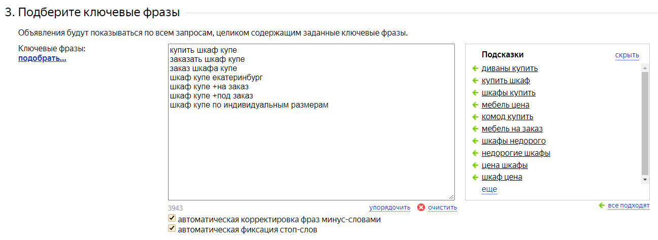 автоматическая корректировка фраз минус-словами;