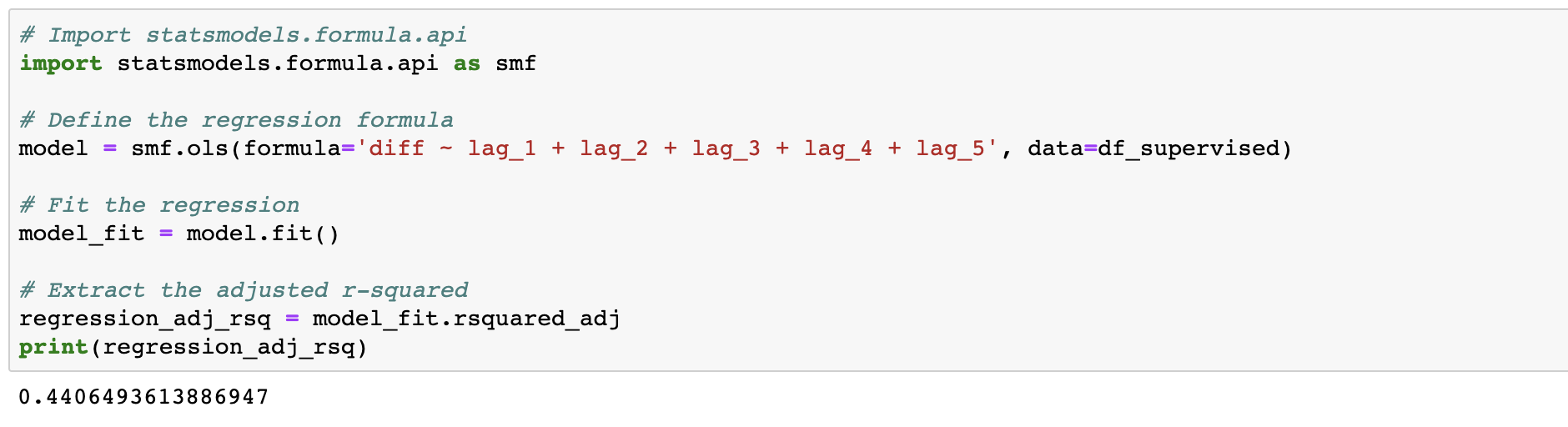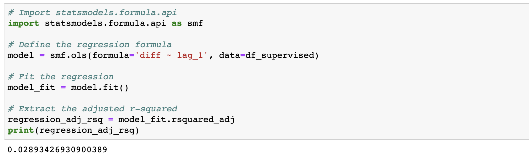 # Import statsmodels.formula.apiimport statsmodels.formula.api as smf# Define the regression formulamodel = smf.ols(formula='diff ~ lag_1', data=df_supervised)# Fit the regressionmodel_fit = model.fit()# Extract the adjusted r-squaredregression_adj_rsq = model_fit.rsquared_adjprint(regression_adj_rsq)