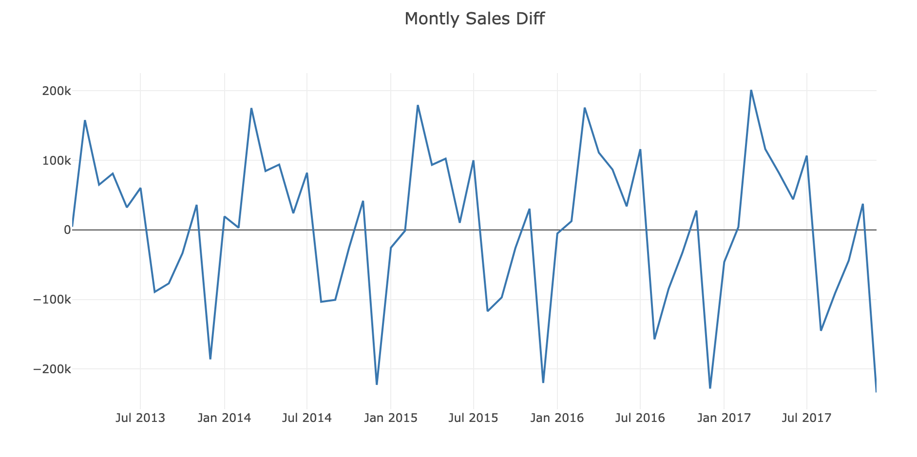 #plot sales diffplot_data = , y=df_diff, )]plot_layout = go.Layout( title='Montly Sales Diff' )fig = go.Figure(data=plot_data, layout=plot_layout)pyoff.iplot(fig)