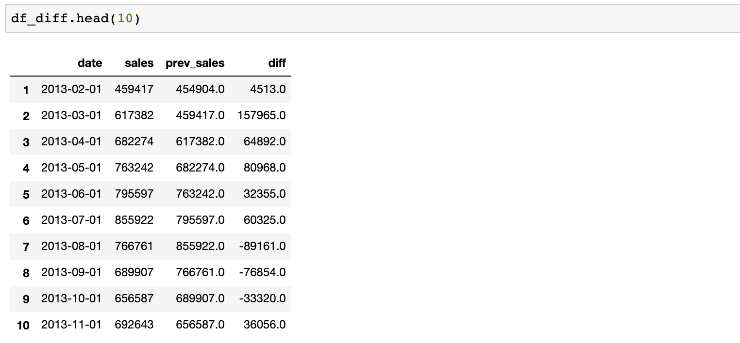 #create a new dataframe to model the differencedf_diff = df_sales.copy()#add previous sales to the next rowdf_diff = df_diff.shift(1)#drop the null values and calculate the differencedf_diff = df_diff.dropna()df_diff = (df_diff - df_diff)df_diff.head(10)