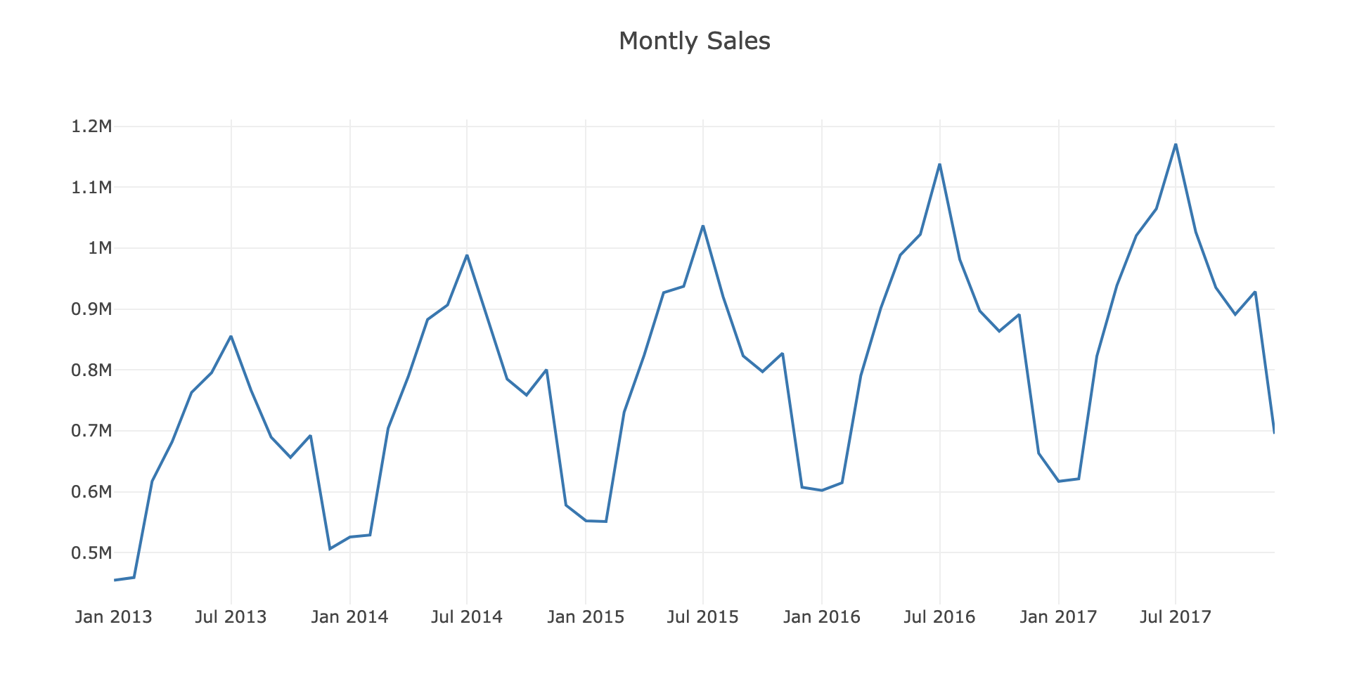 #plot monthly salesplot_data = , y=df_sales, )]plot_layout = go.Layout( title='Montly Sales' )fig = go.Figure(data=plot_data, layout=plot_layout)pyoff.iplot(fig)