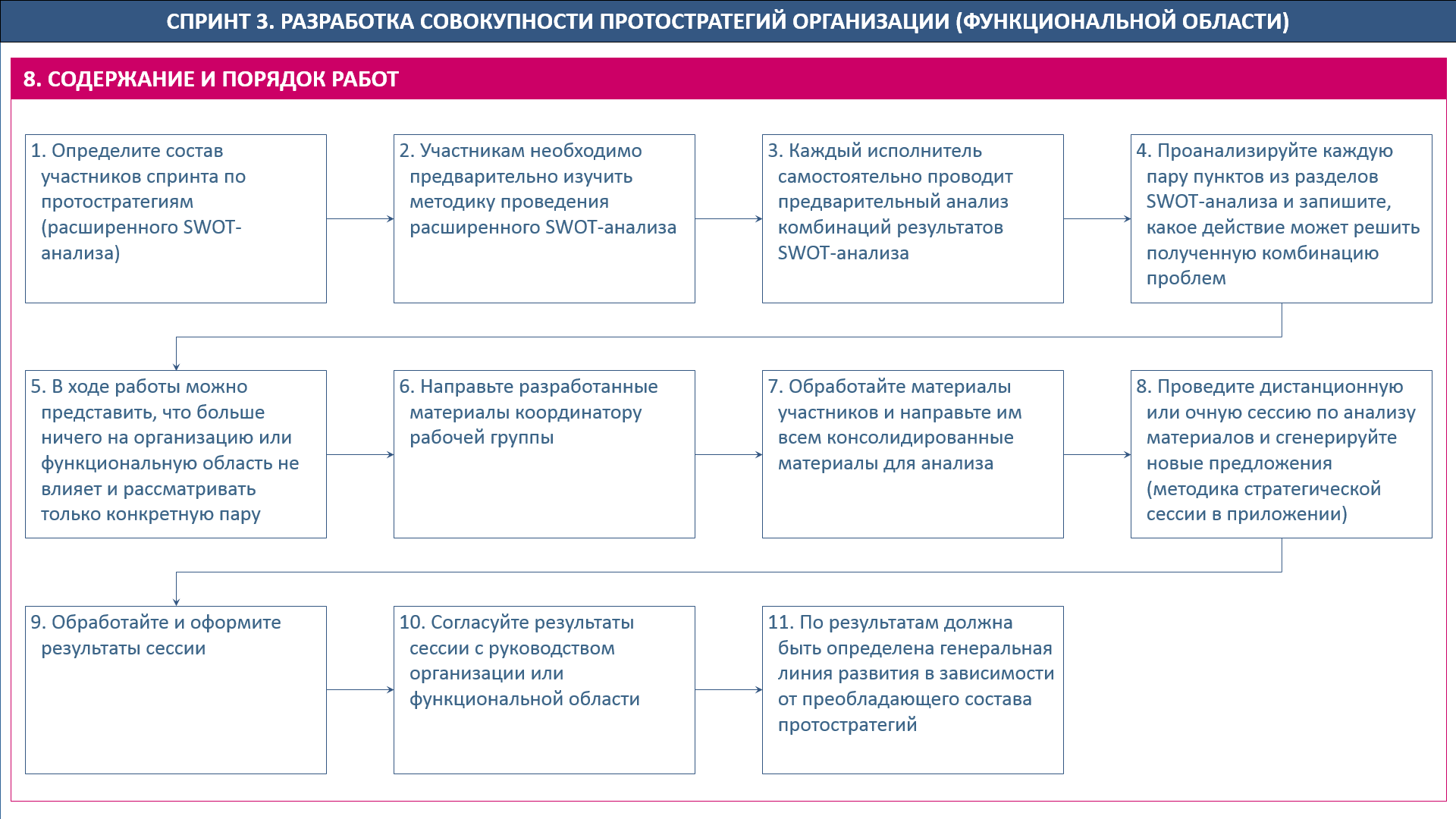 Причем эта работа может происходить, как в дистанционном режиме, когда исполнители параллельно производят поиск протостратегий, так и в классическом режиме, который обычно выглядит как стратегическая сессия или совещание.